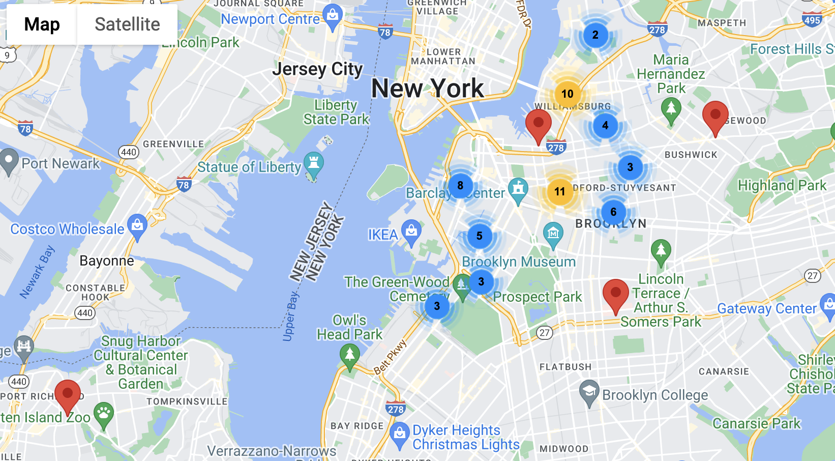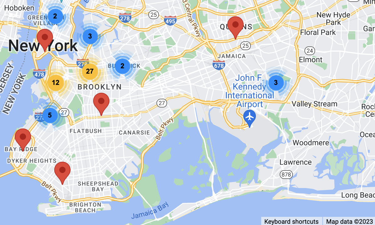 Now it was time to map the addresses onto Google Maps. I downloaded Awesome Table’s Geocoder to do this. I made a new row to concatenate “Brooklyn, NY, USA” to the end of each address to ensure that all points would be in Brooklyn. When I ran the extension and looked at the map, I saw this: