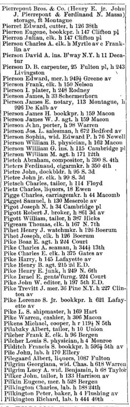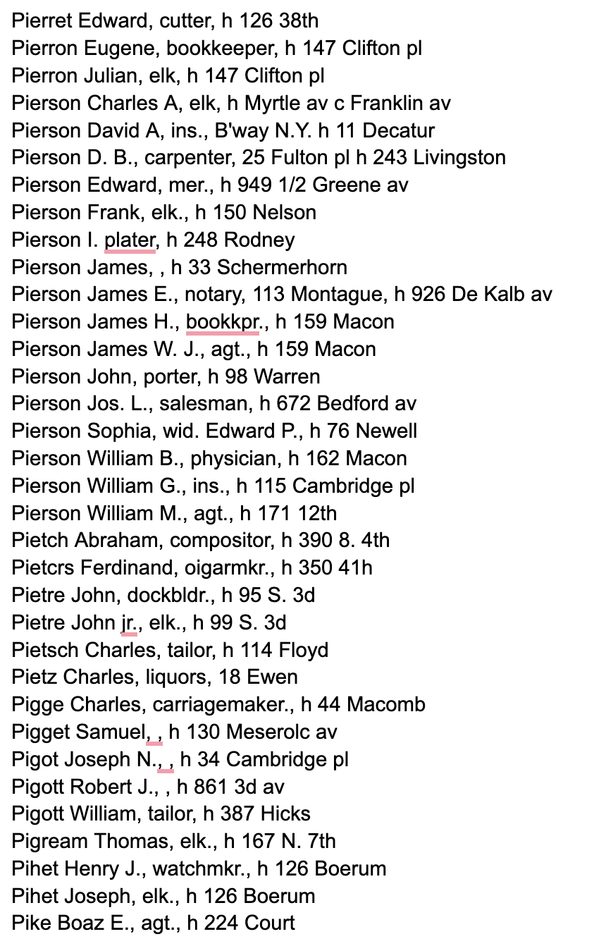For this project, I want to map data from a section of the Brooklyn City and Business Directory for the year ending May 1, 1880, and discuss my findings. The section comes from page 806 section 2, which are last names ranging from PIE-PIL. The reason I chose this specific section is because of my own last name, Pietrafesa. My great-grandparents (on my dad’s dad’s side) first immigrated to New York from Naples, Italy around the 1870s-80s, but my family is not sure of the exact date. Their names are Paul (Paolo) and Anna. They lived in either Brooklyn or Queens at the time. Unfortunately, while looking through the directory, I could not find my last name listed, which could indicate that they had not arrived yet, but I decided to work with this section of data anyway.