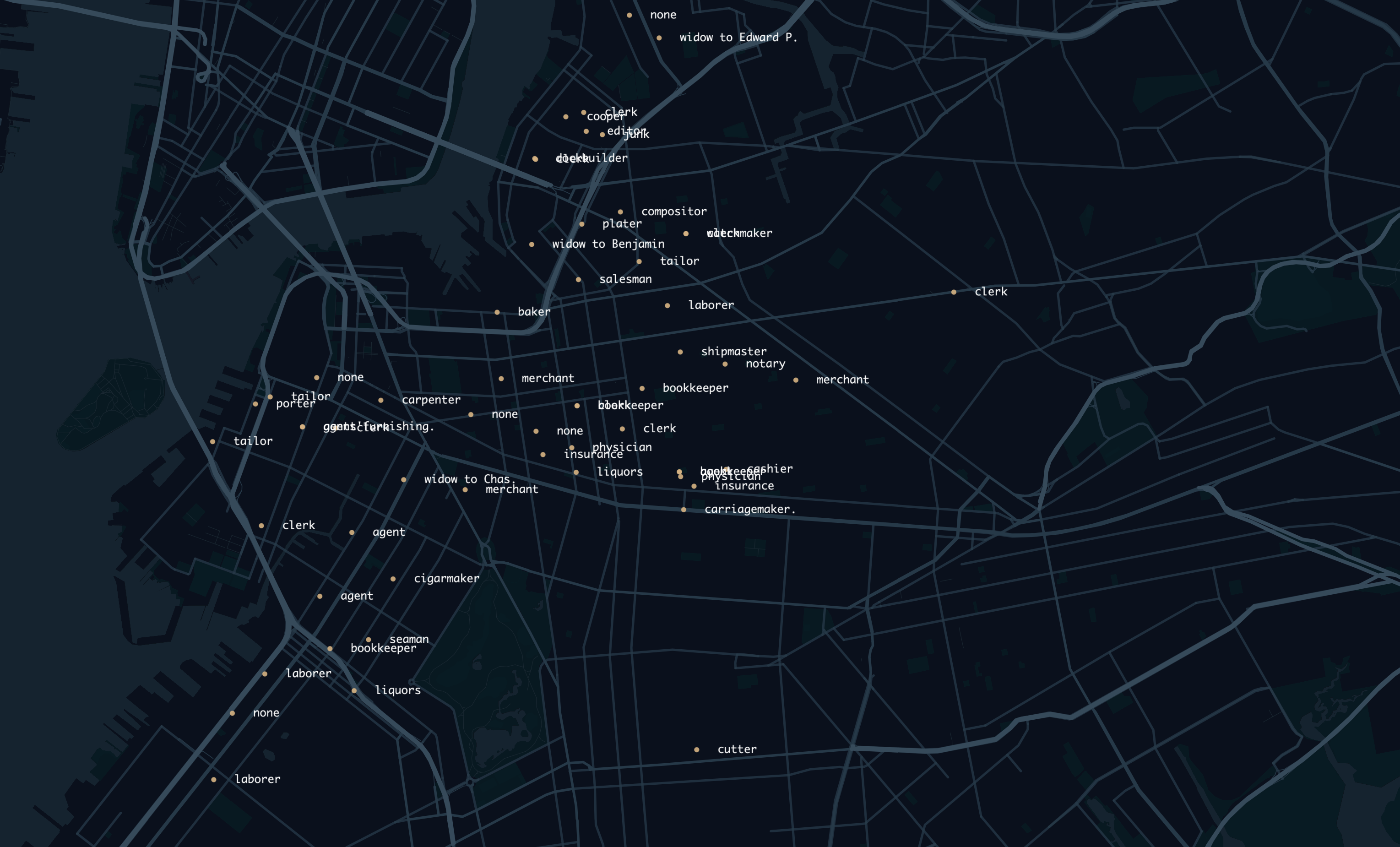 This is a heatmap showing the clusters of addresses, where the larger the circle, the more addresses there are in that area. You can see that all the addresses mapped are in the northern part of Brooklyn, and not the south. Although I live very close to New York City, I don’t actually know much about the history of the city, we only focused broadly on American history in school. After doing some research, I found that areas south of Bedford-Stuyvesant and Prospect Heights (eg. Flatbush or Gravesend) were not actually considered part of Brooklyn at the time, and were instead separate towns. In 1894, 14 years after the publishing of this document, Brooklyn would annex these southern towns, becoming part of New York City. This made me wonder if perhaps my great-grandparents did indeed live in modern-day Brooklyn at the time of this being published, they just lived in an area not considered Brooklyn at the time. Again, I don’t know exactly where or when my great-grandparents lived in New York City, so I can only make assumptions. Now knowing this information about Brooklyn, I concluded that there was not really a more densely populated region of Brooklyn, From what I can see the data points are mostly evenly spread out. After looking at this data, I wanted to next look at a map of all the occupations to see if certain occupations are more likely to appear in one area than another. The map looked like this: