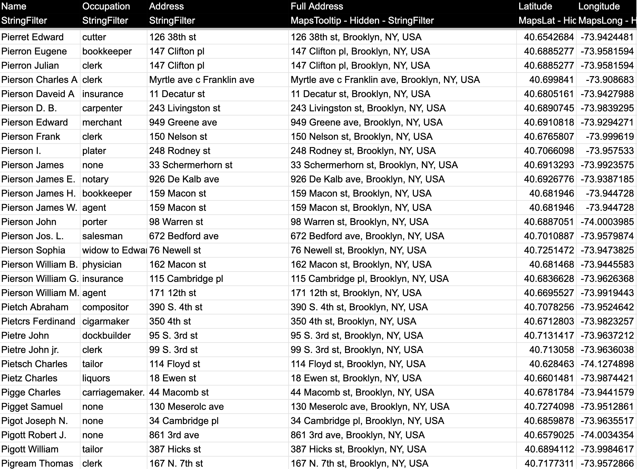 Once that was done, I began formatting the rest of the data so that there would be as little errors as possible. I first started by correcting any mistakes the OCR had with spelling. After that, I wanted to unabbreviate things such as the occupations. It was weird seeing jobs such as clerk, merchant, and laborer, which aren’t very descriptive as jobs and you don’t hear today as job occupations. I also found it strange that some of the women had their occupation just listed as “widow to X”. I’m not really sure why widow is listed as an occupation. Once this was done, all that was left was to format the addresses, which was the messiest part. The first thing I noticed was that certain numbers were abbreviated differently than they are today. The main ones being 2nd and 3rd, which were instead written as “2d” and “3d”. I checked the original document to make sure this wasn’t an error on the OCR’s part, and it indeed was not. I also noticed that avenue was abbreviated as “av” rather than “ave” and corner was abbreviated as just “c”, which is usually not included in formal addresses. I also noticed that some of the numbers had ½ as part of their number address, which I did not know existed. The last thing that I saw with the addresses was that most of them simply did not have a street ending to them, like st, ct, pl, etc. I realized that there were no addresses ending in st, so I assumed that any of these missing endings were in fact ending with st. I looked up some of the street names on Google Maps to confirm this. I did not fill these in, because I thought that the geocoder might’ve been able to properly map these.